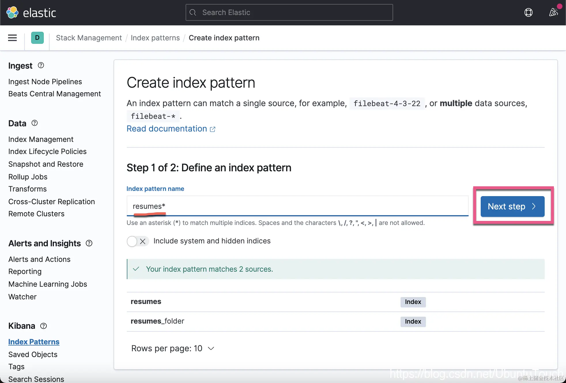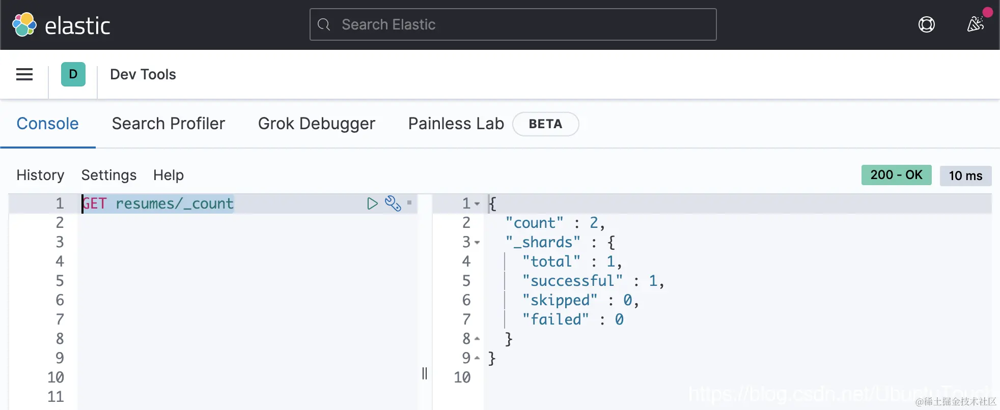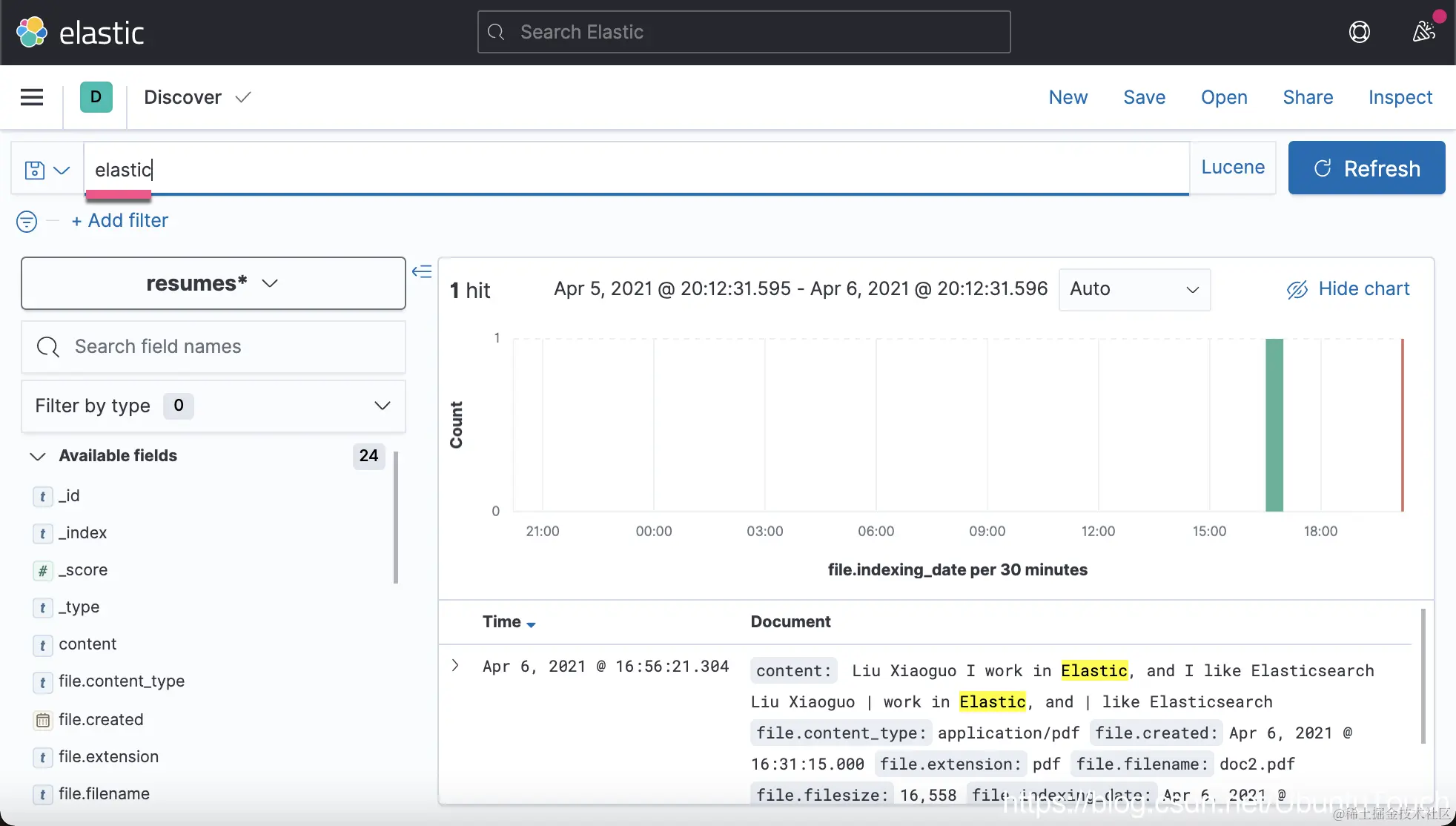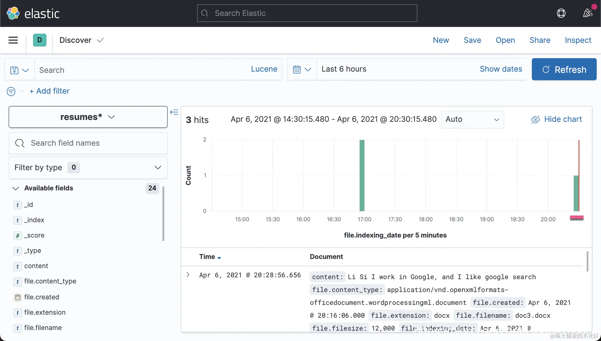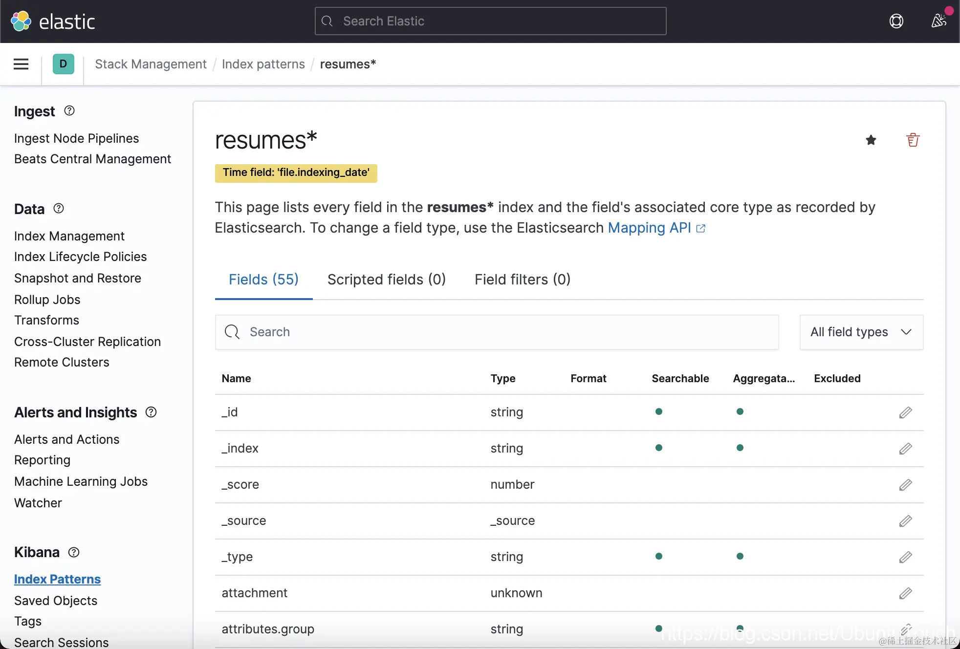 我们可以在 Kibana 中查看到一个叫做 resumes 的索引: