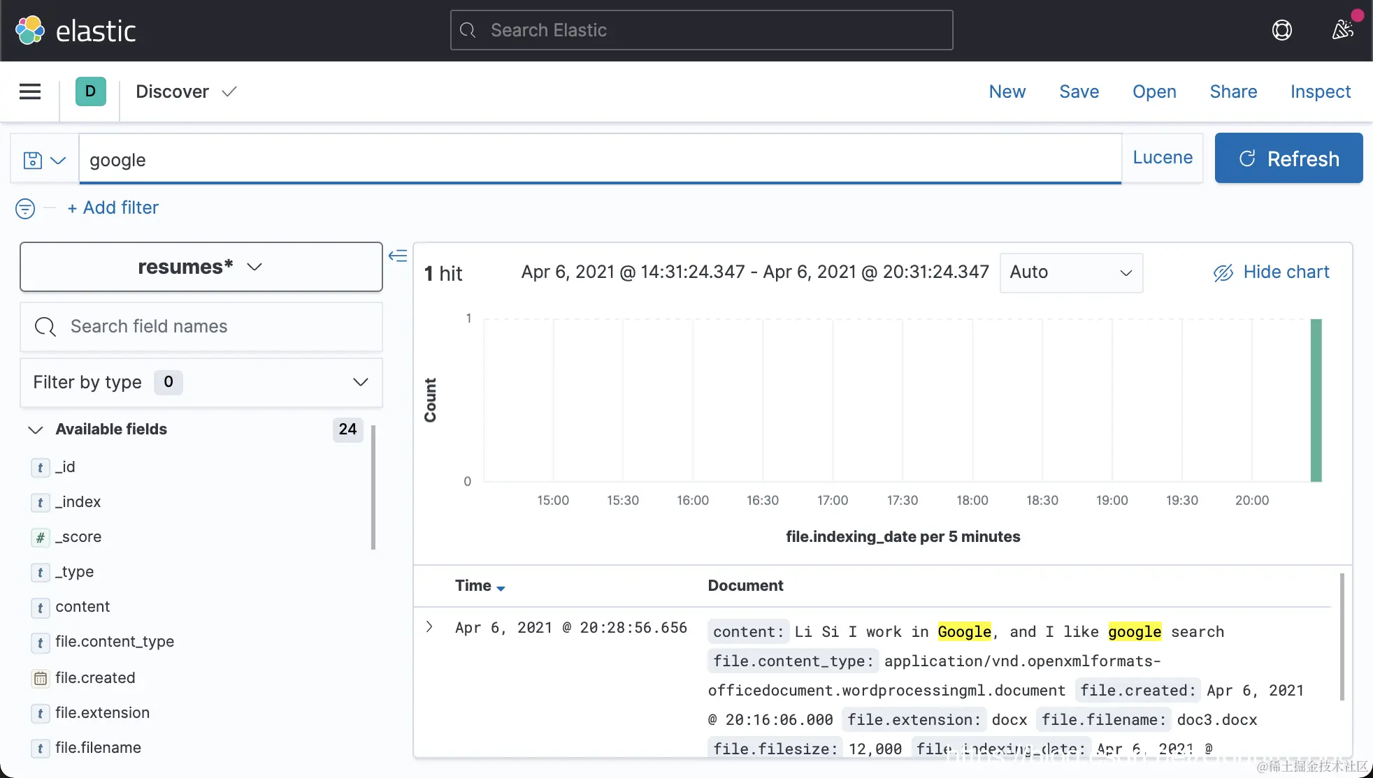 我们可以看到一个新的文档被导入。从上面,我们可以看到三个文档被导入。我们来搜索一下 google: