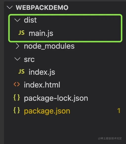 会自动生成一个dist文件夹,默认 入口文件是src/index.js, 默认打包后文件是dist/main.js,此时需要在index.html中手动引入dist/main.js。