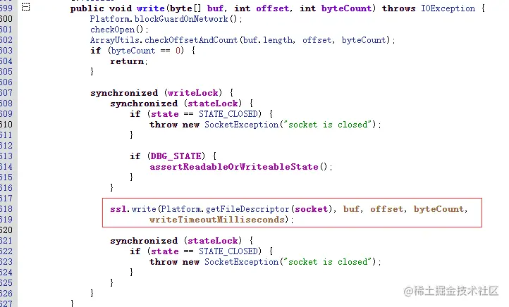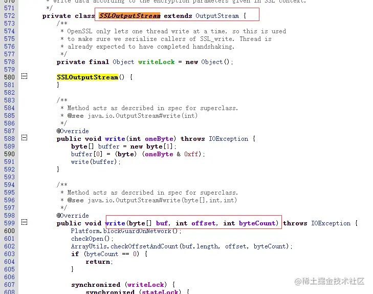 然后在源码文件搜索内部类SSLOutputStream,是继承OutputStream,然后对原来的write方法进行重写
