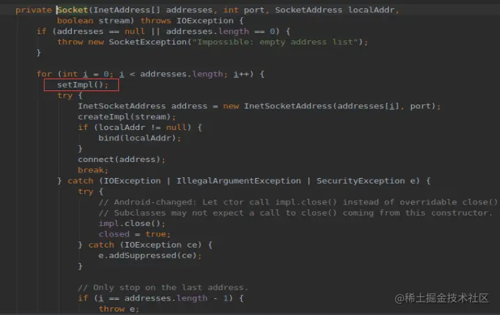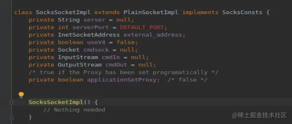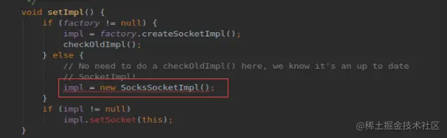 看到两次赋值的值都是null,所以走else,跟进 SocksSocketImpl();,这里就到socket实现的地方。