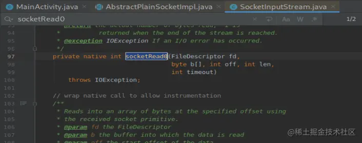 接受数据是InputStream,调用的是socket的getInputStream,getInputStream和getOuputStream是成对出现的,按着刚才的思路可以找到。或者,socketWrite0()是在SocketOutputStream,那么socketRead0()就是在SocketInputStream里。
