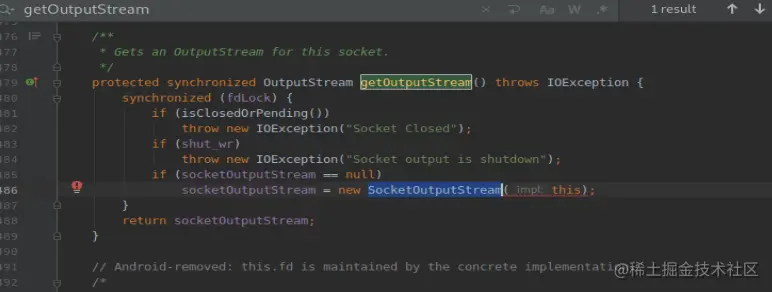 再搜索,发现找到了getOutputStream()实现的地方,两个if都是抛出异常,看第三个if,跟进SocketOutputStream(),