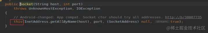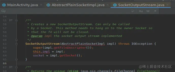 这是socket发送http请求的数据包,把数据包写进outputStream后进行发送,outputStream是socket对象的方法,先看一下socket的实现。跟进一下socket的实现