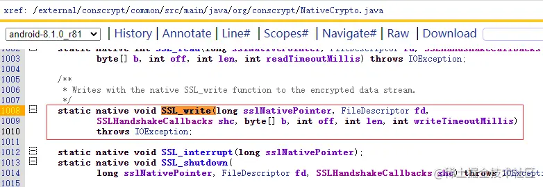 再跟踪NativeCrypto.SSL_write(),又到了native层,可以说已经在java层跟到底了