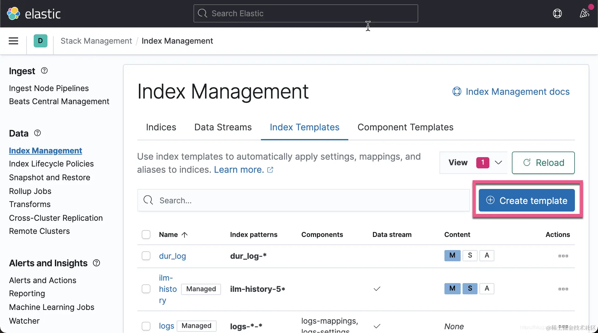 1)转到 Kibana > 堆栈管理 > 索引管理 > 索引模板 > 创建模板