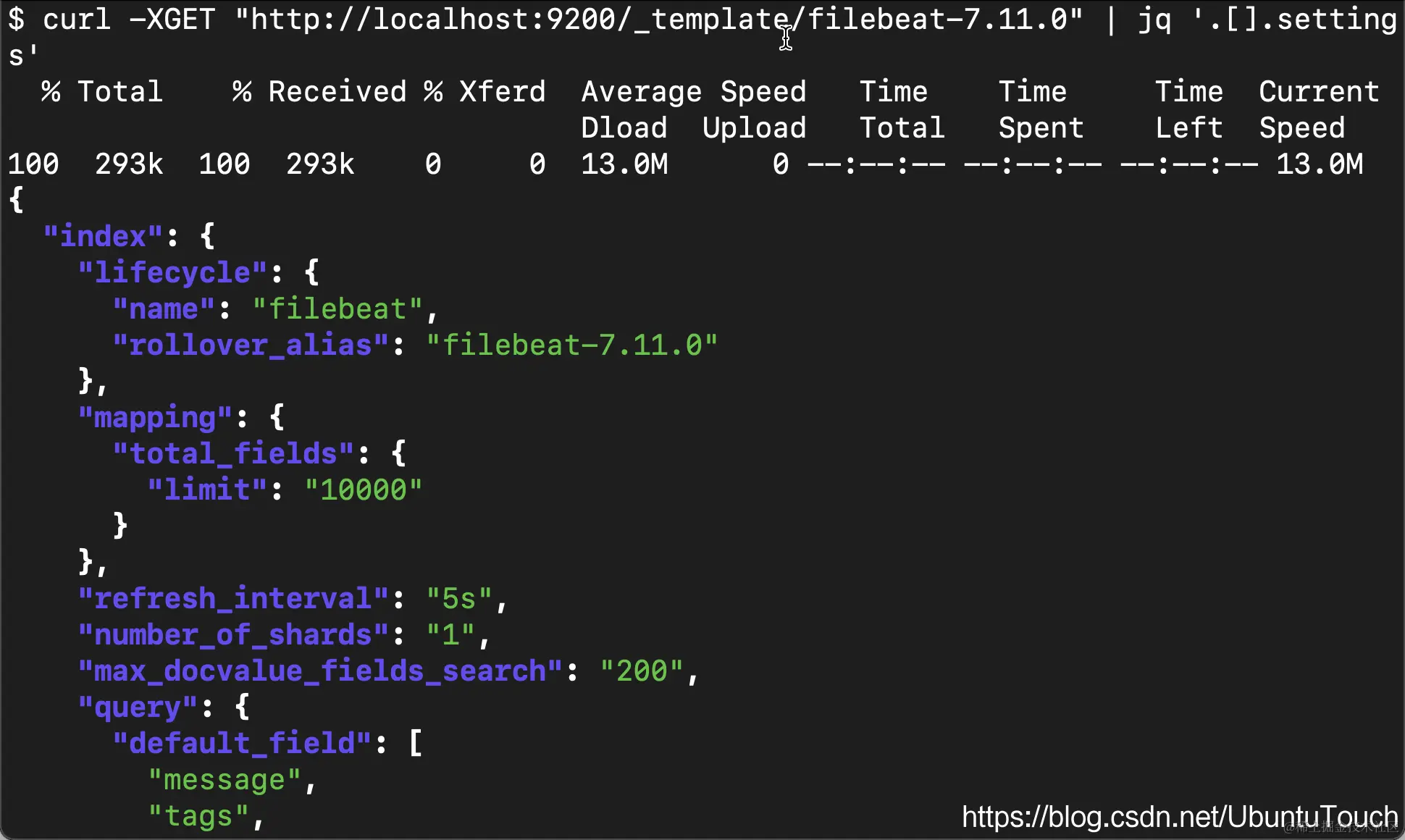 curl -XGET "https://<Elasticsearch>:<port>/_template/filebeat-7.10.1" -u elastic | 'jq .[].settings'