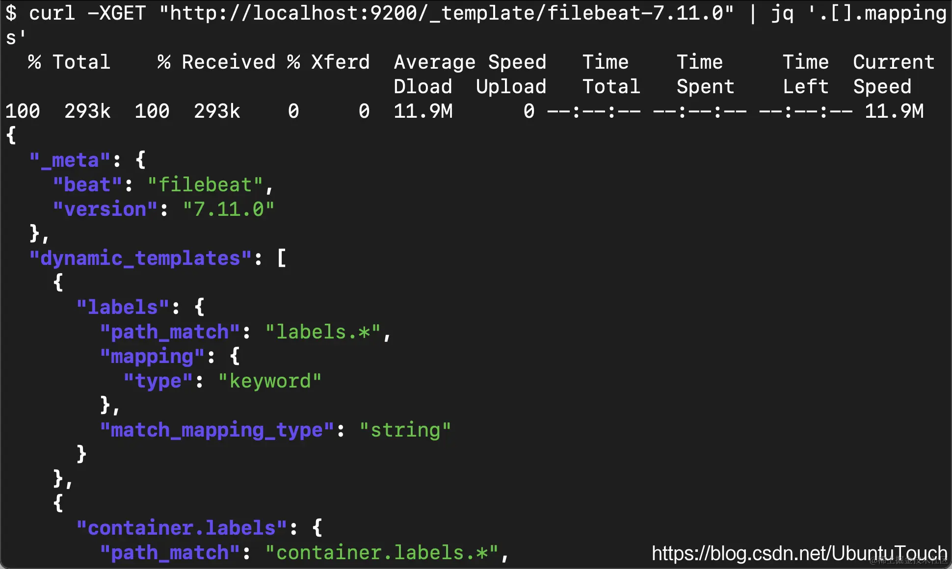 curl -XGET "https://<Elasticsearch>:<port>/_template/filebeat-7.10.1" -u elastic | jq .[].mappings