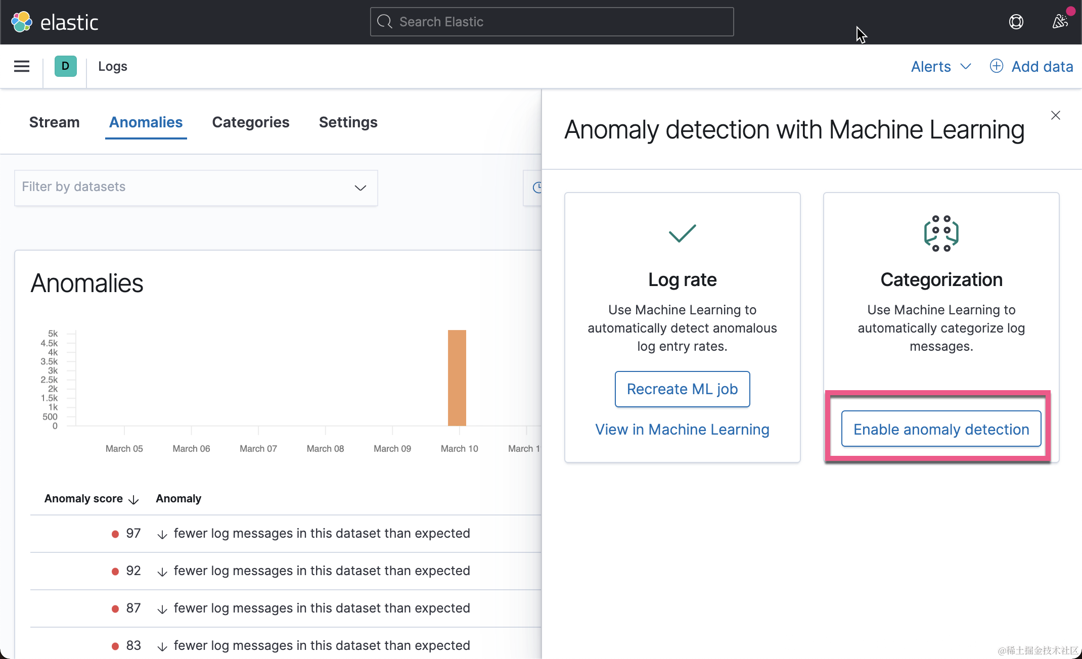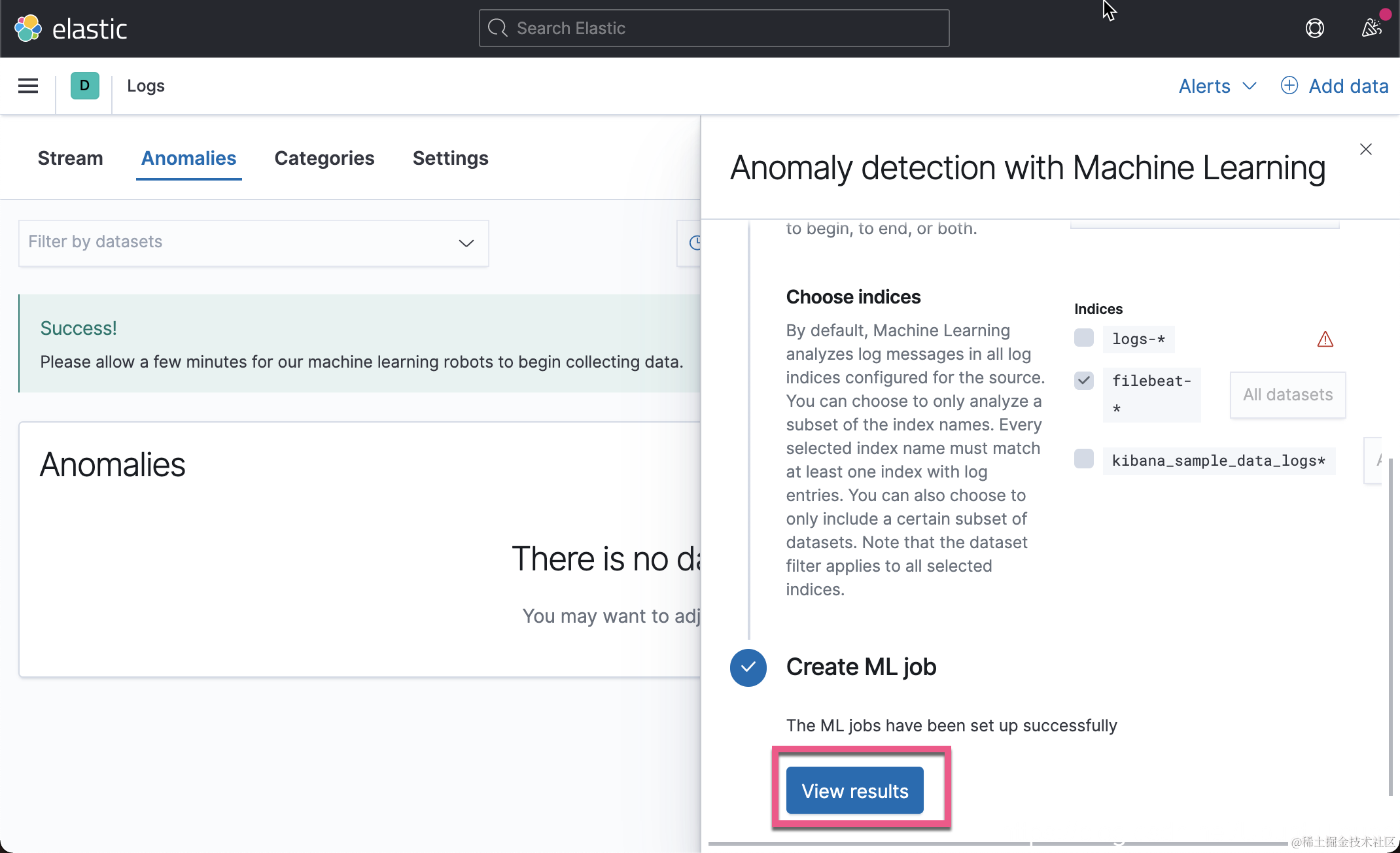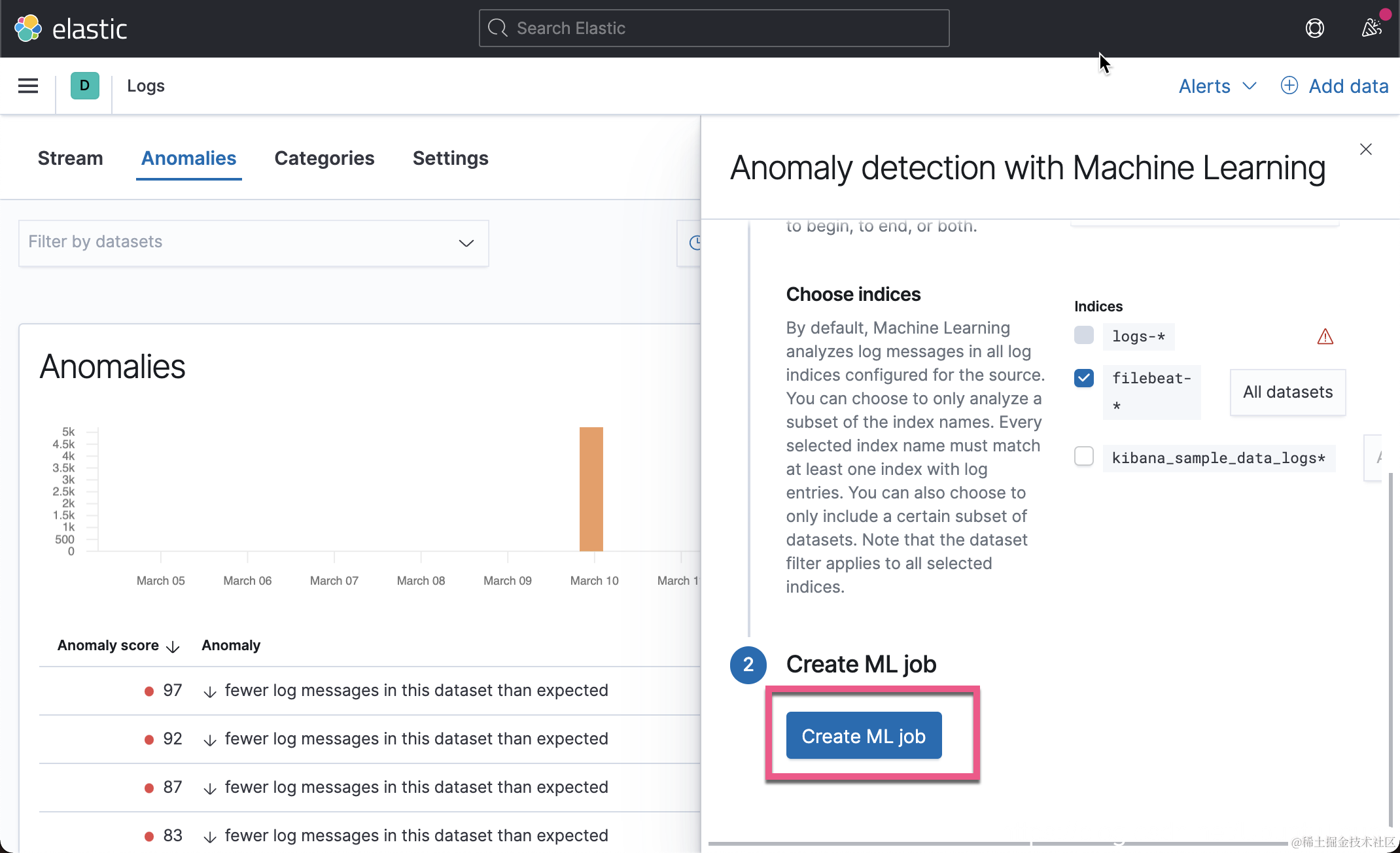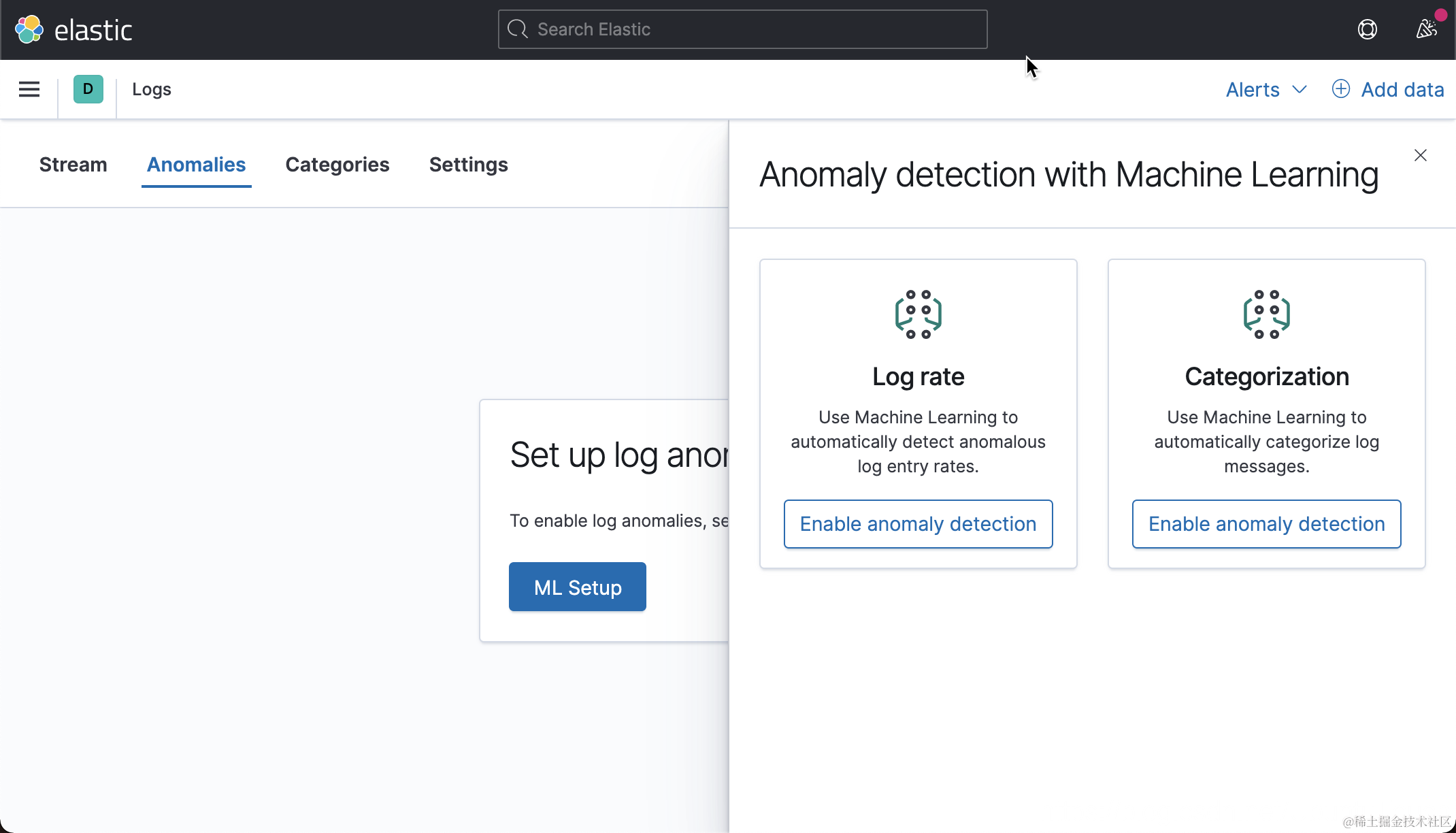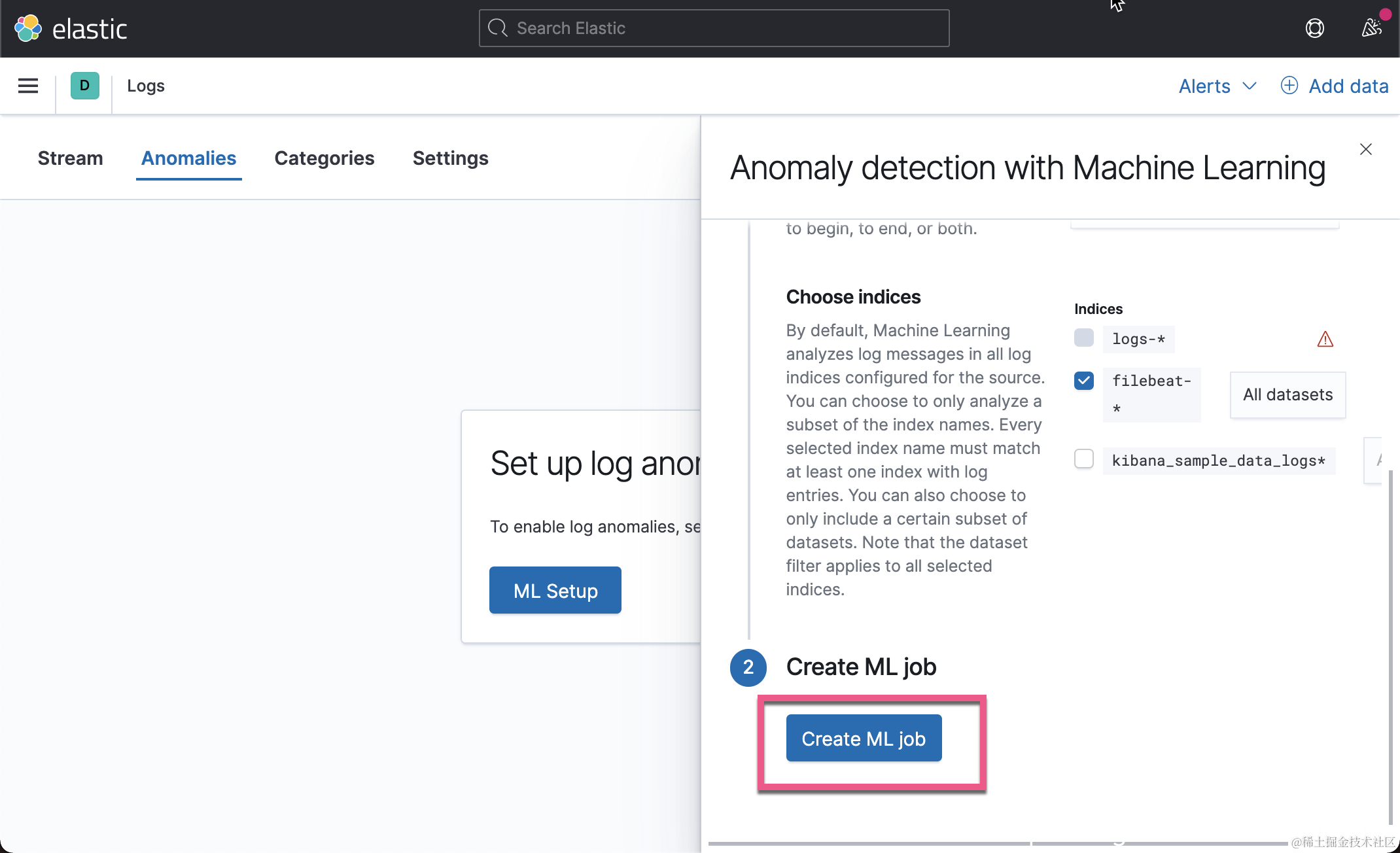在上面,我们已经为你创建了两种类型的异常检测。Log rate 可以帮我们自动检测有没有在一个时间里突然发生很多的日志,或者日志的数量骤然减少。另外 Categorization 可以帮我们自动把日志的种类进行分类,并进行异常检测。这些异常检测的设置非常简单,基本都是开箱即用: