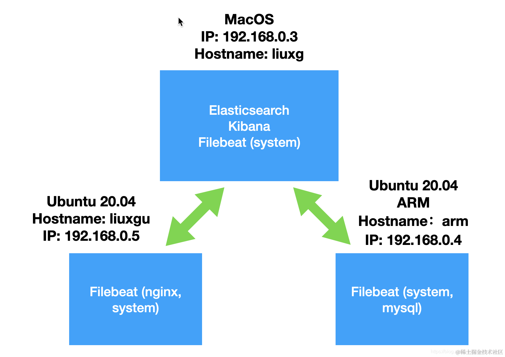 在 Kibana 中有一个叫做 Logs 的应用。它为我们的日志的可观测性提供了良好的可操控性。在今天的文章中,我来介绍如何使用这个应用。在今天的展示中,我采用了如下的架构来收集不同机器的日志: