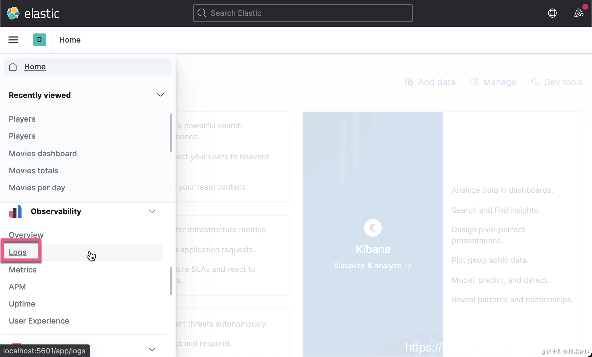 首先,我们启动 Kibana,并启动 Logs 应用: