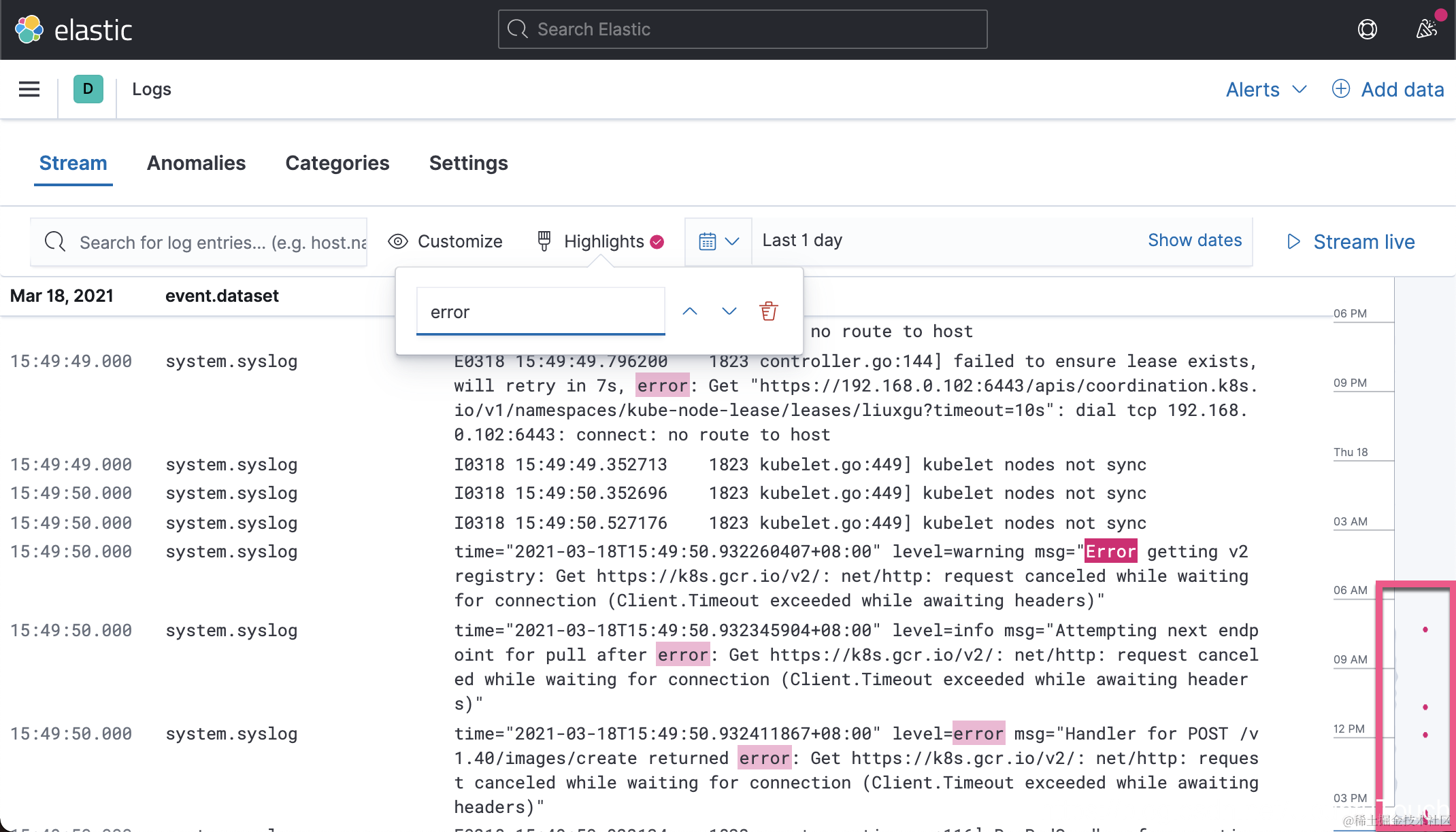 我们可以通过修改时间过滤器来对相应的时间窗口的日志进行查询。