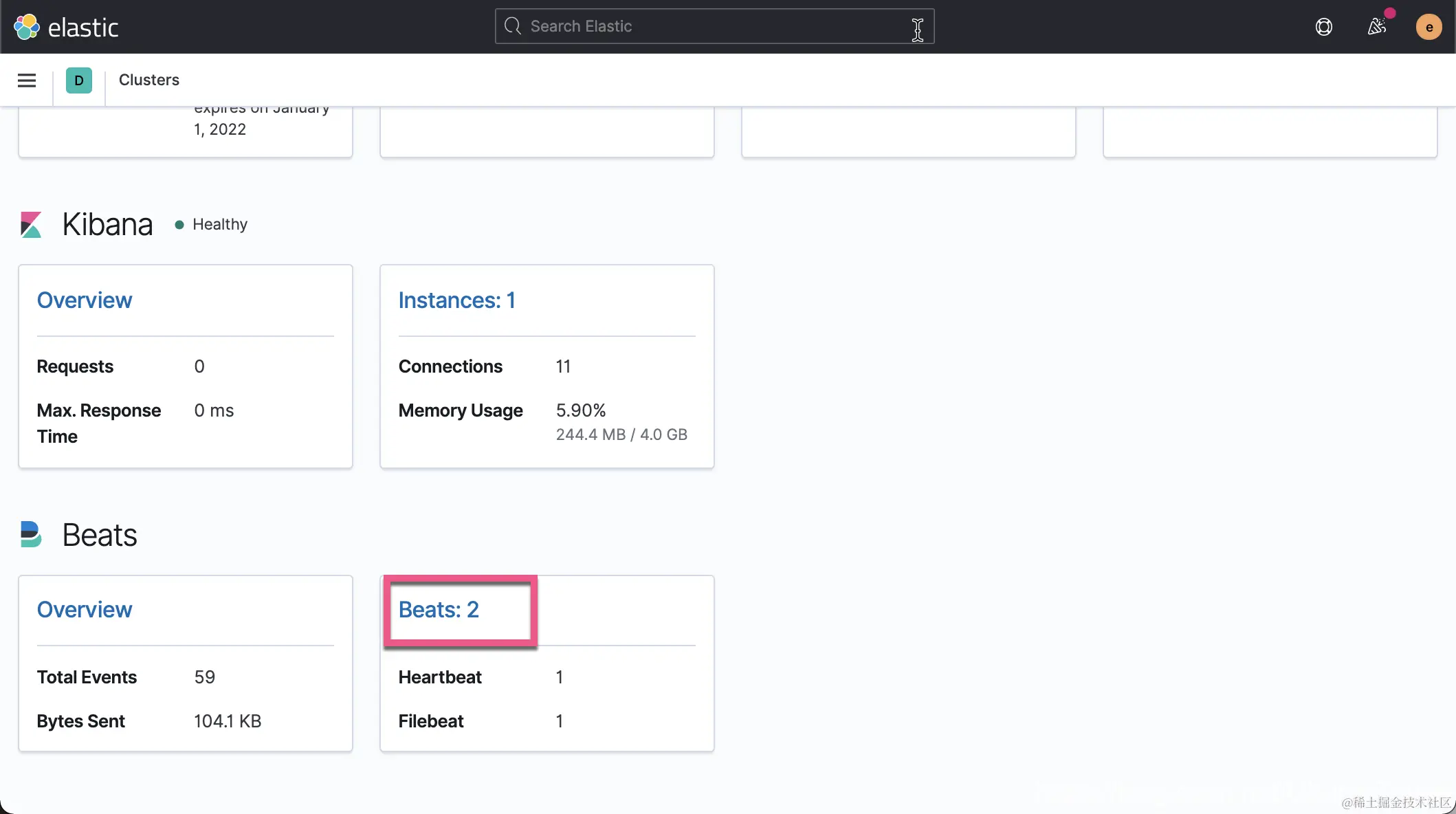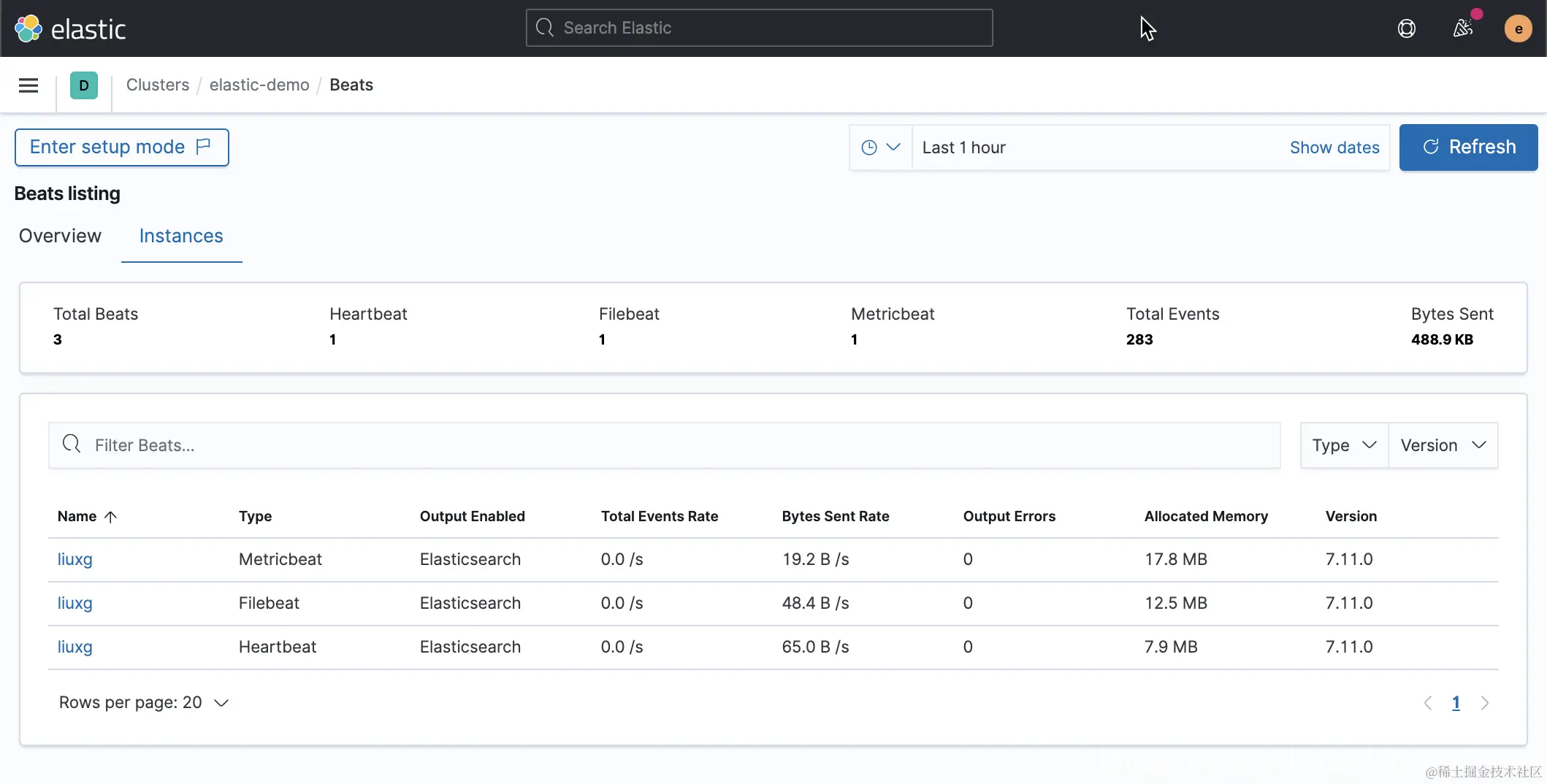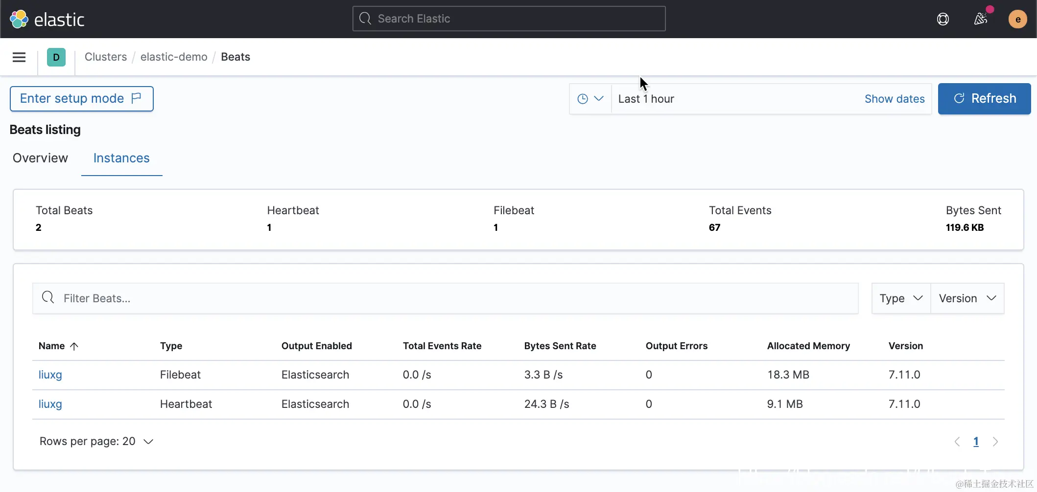 回到 Metricbeat 的监控界面,我们可以看到有两个 Beats 被监控:
