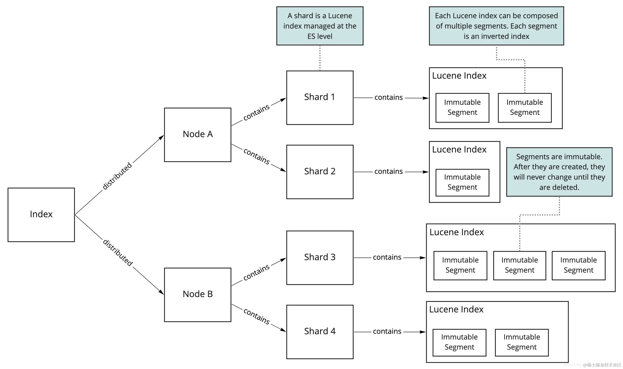 每个分片都是一个 Lucene 索引,这些索引中的每个索引都可以具有多个 segment,每个 segement 都是一个反向索引。