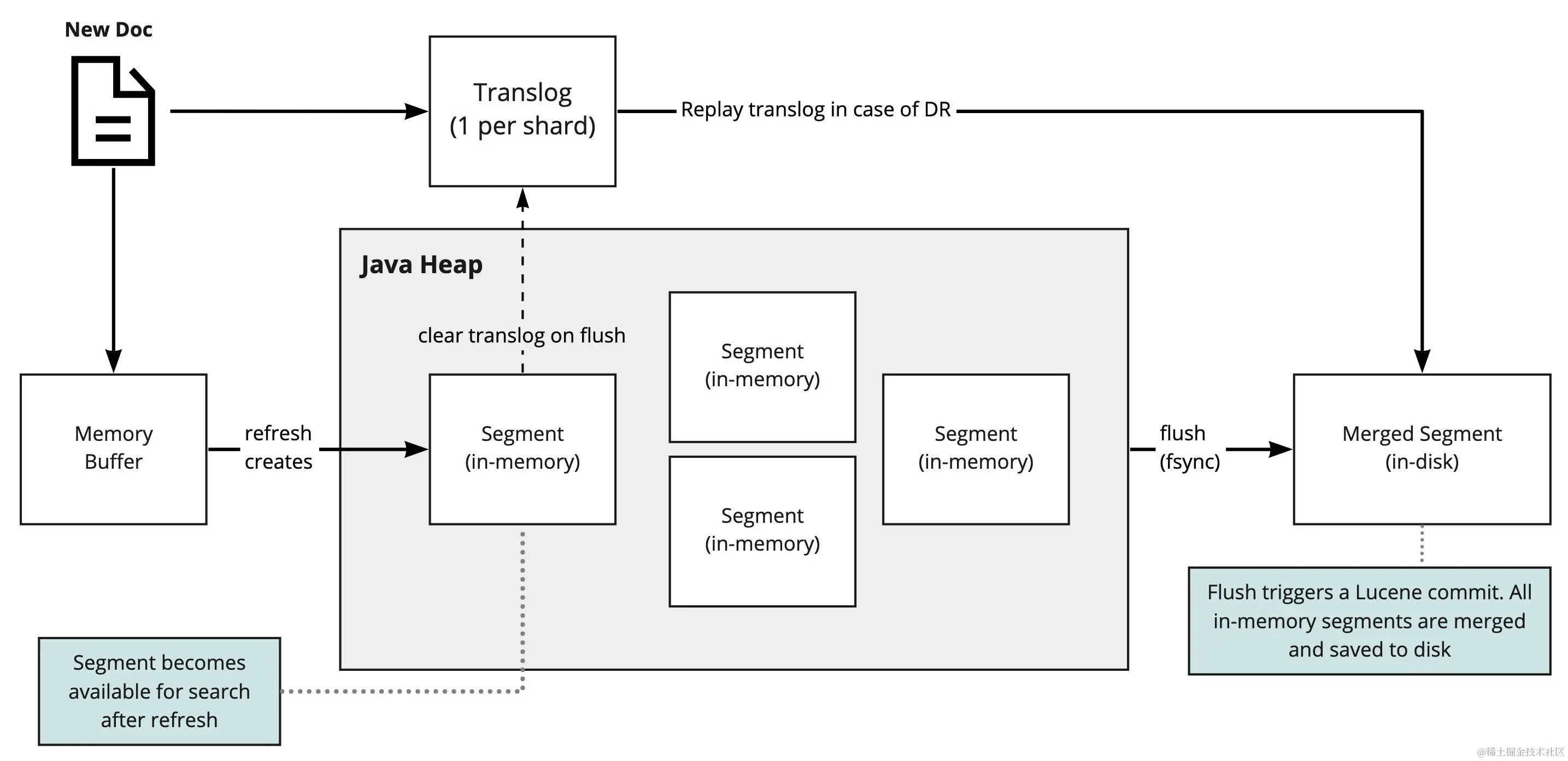 在此图中,我们可以看到 Elasticsearch 如何存储新文档。一旦文档到达,它将被提交到一个称为 “translog” 的事务日志和一个内存缓冲区。