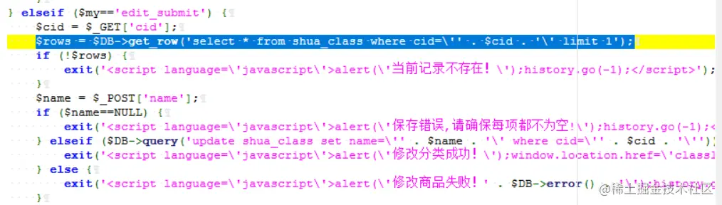 elseif ($my=='edit\_submit') { $cid = $\_GET\['cid'\]; $rows = $DB->get\_row('select * from shua\_class where cid=\\'' . $cid . '\\' limit 1'); if (!$rows) { exit('<script language=\\'javascript\\'>alert(\\'当前记录不存在!\\');history.go(-1);</script>'); }