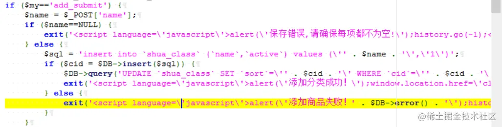 if ($my=='add\_submit') { $name = $\_POST\['name'\]; if ($name==NULL) { exit('<script language=\\'javascript\\'>alert(\\'保存错误,请确保每项都不为空!\\');history.go(-1);</script>'); } else { $sql = 'insert into \`shua_class\` (\`name\`,\`active\`) values (\\'' . $name . '\\',\\'1\\')';