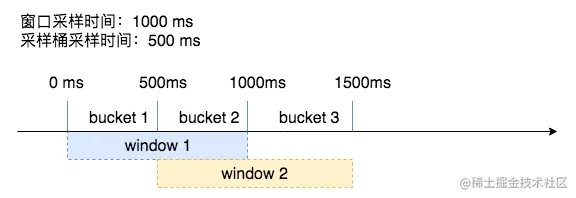 如上图,展示了一个具有两个桶(bucket)的滑动窗口(rolling window)。整个滑动窗口用来保存最近 1s 的采样数据,每个小的桶用来保存 500ms 的采样数据。 当时间流动之后,过期的桶会自动被新桶的数据覆盖掉,在图中,在 1000-1500ms 时,bucket 1 的数据因为过期而被丢弃,之后 bucket 3 的数据填到了窗口的头部。
