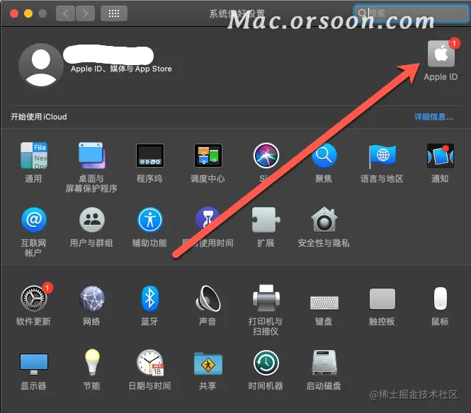 2.打开偏好设置面板后,点击面板右侧的的Apple ID项。
