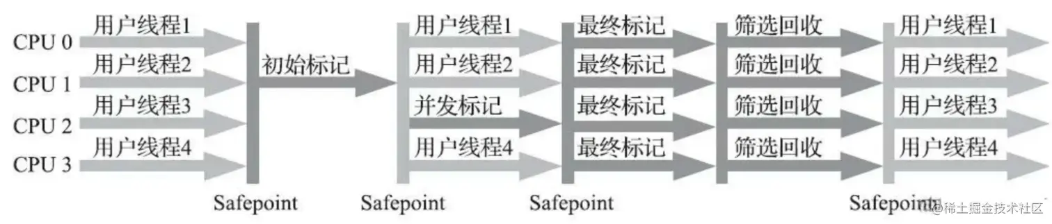 - 并发标记(CMS concurrent mark): 并发标记阶段就是从GC Roots的直接关联对象开始遍历整个对象图的过程,这个过程耗时较长但是不需要停顿用户线程,可以与垃圾收集线程一起并发运行。