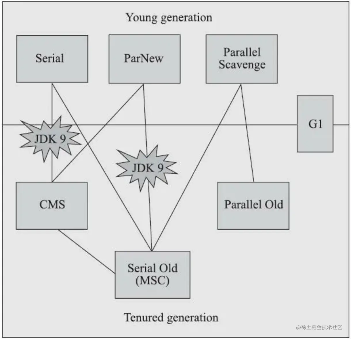 如果两个收集器之间存在连线,就说明它们可以搭配使用 ,图中收集器所处的区域,则表示它是属于新生代收集器抑或是老年代收集器。