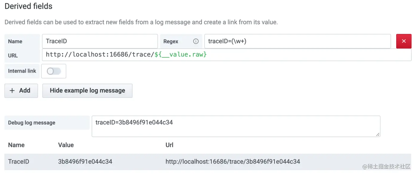 除此之外,还需要对Loki日志的解析方式进行配置,将Loki的日志字段映射为Grafana的派生字段,如下图所示: