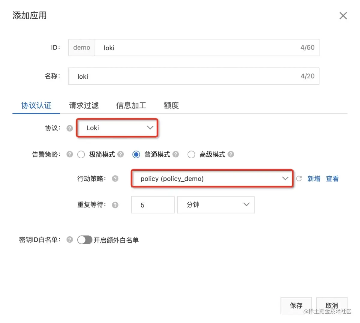 在弹出的对话框中点击创建,添加新的应用,点击保存。这里的协议请选择Loki,行动策略选择在第一步中配置的策略,其余选项可选择默认值。