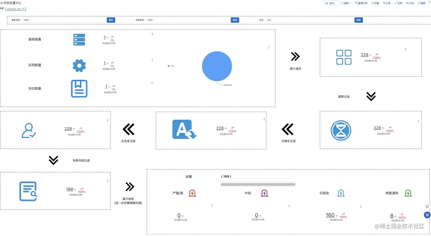 在开放告警大盘,可以查看告警消息过滤、发送情况。
