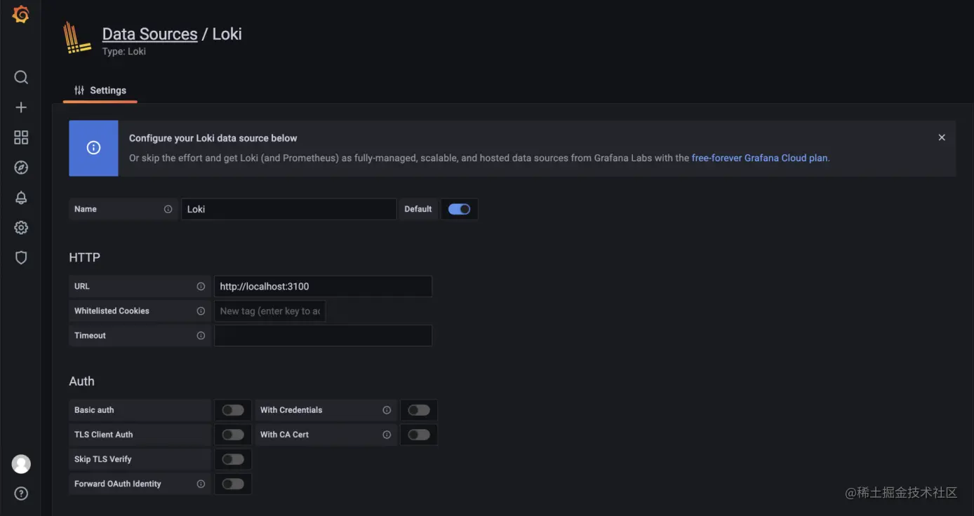 在Grafana界面上,单击Configuration下的Data Source选项,并选择Loki。在弹出的页面中,对Loki进行配置,如下图所示:
