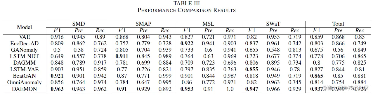 在对比算法方面,作者对比了8种现有的算法,其中VAE算法是DAEMON去掉GAN结构后的结构,目的是为了测试GAN约束的有效性。为了体现本文GAN结构的有效性以及创新型,作者还对比了另外两种利用GAN结构的异常检测算法GANomaly以及BeatGAN。其次,OmniAnomaly是业界著名AIOps团队,北大的裴丹教授团队发表在KDD上的异常检测算法。