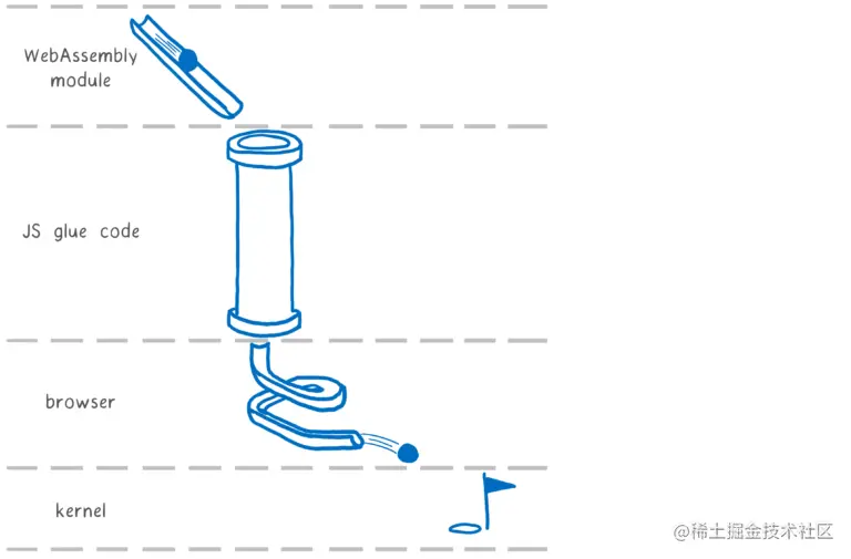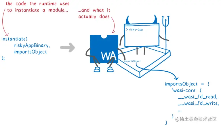 这意味着代码不能直接与操作系统对话。但是它如何处理系统资源呢?宿主(可能是浏览器,也可能是 Wasm 运行时)将函数放入代码可以使用的沙箱中。