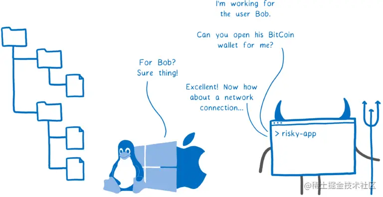 例如,假设你在应用程序中使用的库有一个新的维护者(就像在开源中经常发生的那样)。那个维护者可能对你很感兴趣……,或者他们可能是坏人之一。如果他们有权在你的系统上执行任何操作,例如打开你的任何文件并通过网络发送它们,那么他们的代码可能会造成很大的破坏。