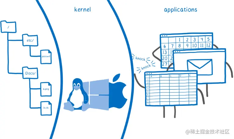 通过 protection ring security,操作系统基本上在系统资源周围设置了一个保护屏障。这是 kernel(即内核)。kernel 是唯一可以执行诸如创建新文件或打开文件或打开网络连接之类的操作的东西。