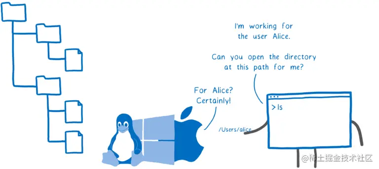 例如,程序可能会要求操作系统打开一个文件。用户拥有他们有权访问的特定文件集。