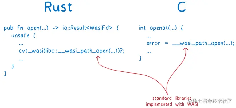 像 Rust 这样的语言将直接在其标准库中使用 wasi-core。例如,Rust 的 open 是通过在编译为 WebAssembly 时调用 __wasi_path_open 来实现的。