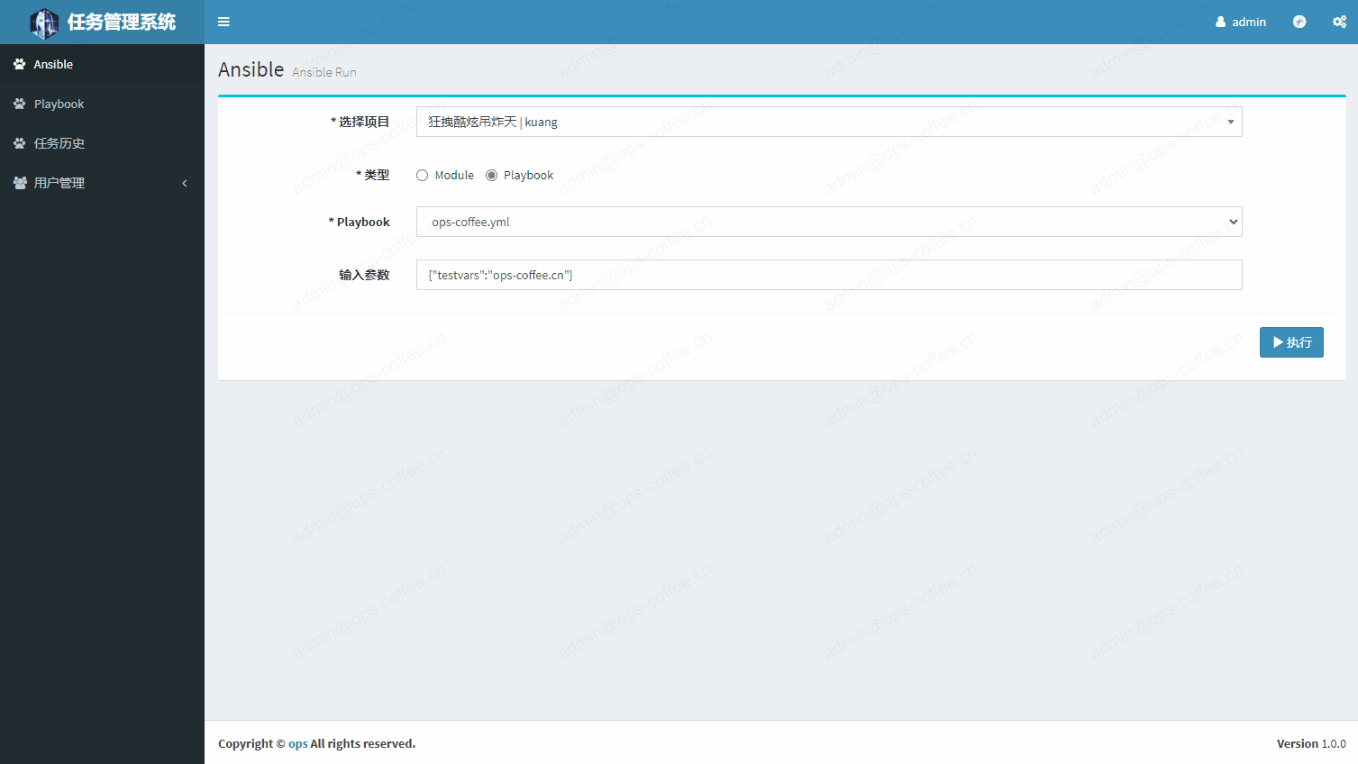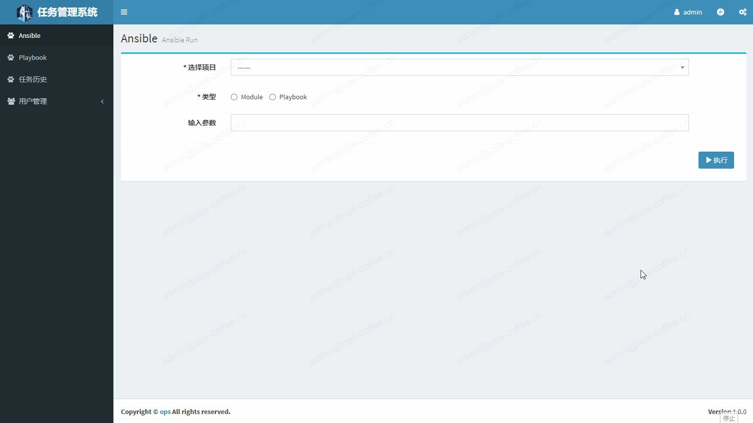 根据上边的思路,我们来想一下都需要编写哪些页面,首先需要一个任务执行页面,在这个页面里需要选择是本次任务是运行module还是Playbook,如果是需要运行module,则需要用户选择具体的module和输入参数,如果需要运行playbook,则需要用户选择具体的playbook和输入参数,无论是运行module还是playbook,都需要确定在哪些主机上运行