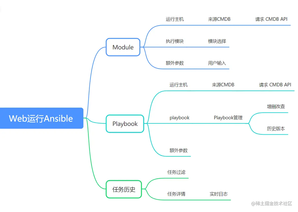 可以通过Web运行Ansible的Module和Playbook这是我们的目标,要实现这个目标我们要做哪些功能呢?我大概画了个脑图帮助整理思路