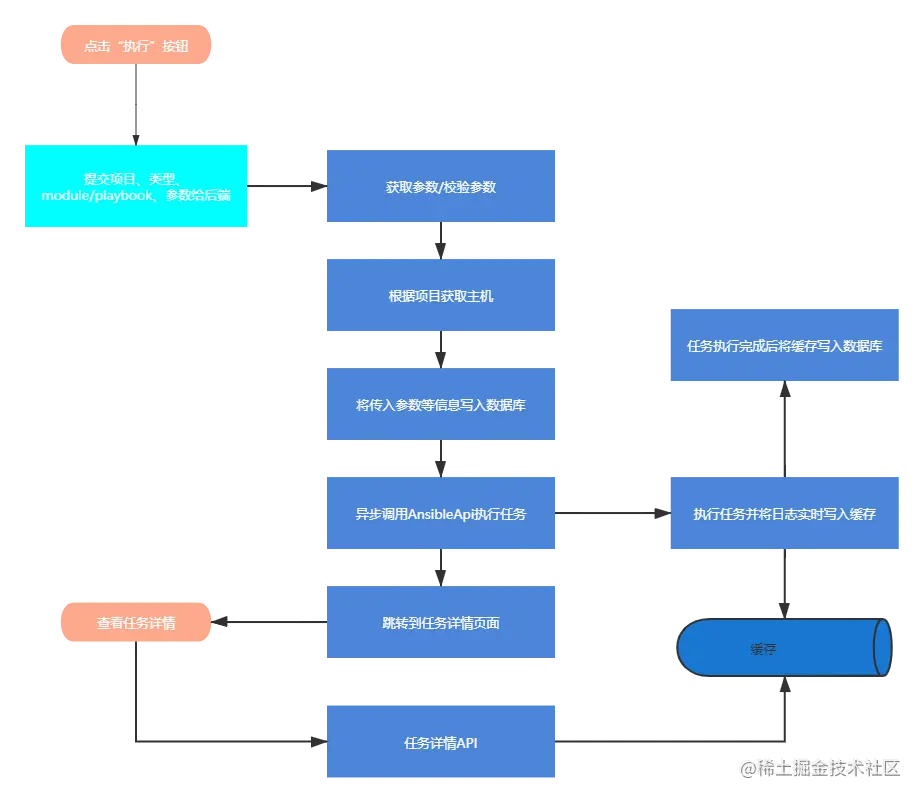AnsibleAPI执行过程中将日志实时写入缓存,同时可以通过websocket推给任务详情页面,任务详情页面接受到数据之后展示,如果觉得使用websocket没必要也可以像我一样直接在任务详情页启动一个循环,每秒请求日志将更新追加到页面上,在任务执行完成后,将缓存数据写入数据库,这样的好处是可以减少对数据库的读写,提高效率,整个流程大概如下