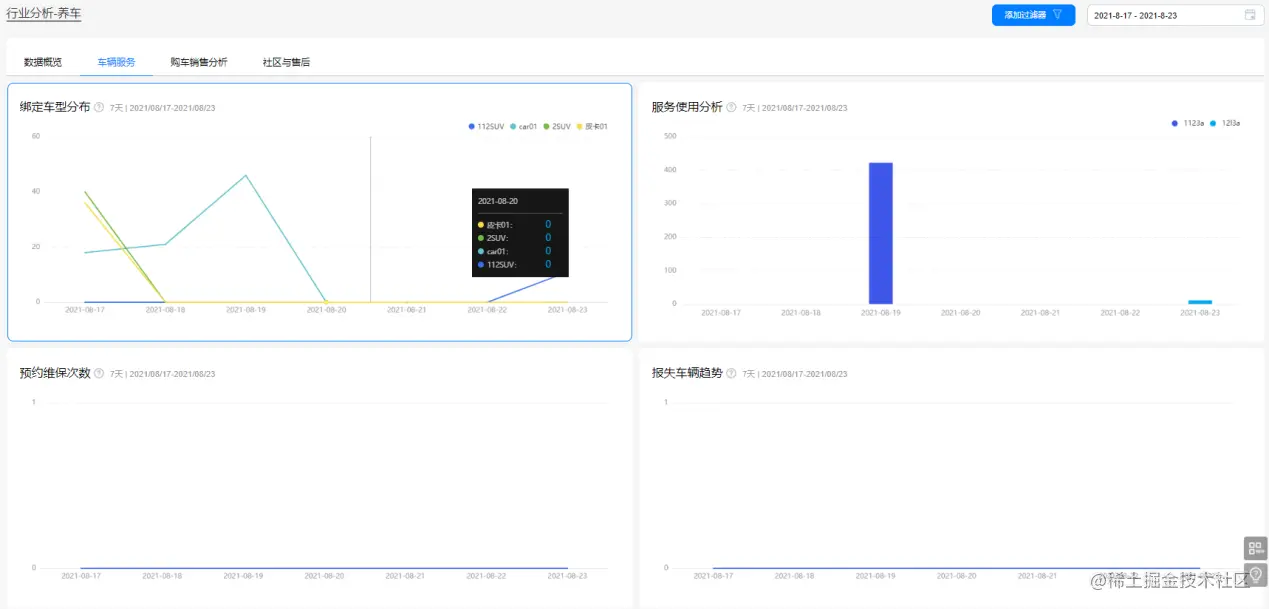 车辆服务看板从绑定车型分布、服务使用分析、预约维保次数、报失车辆趋势,展现车主用户养车偏好,帮助企业优化养护服务并进行针对性推荐,更好地为客户服务。