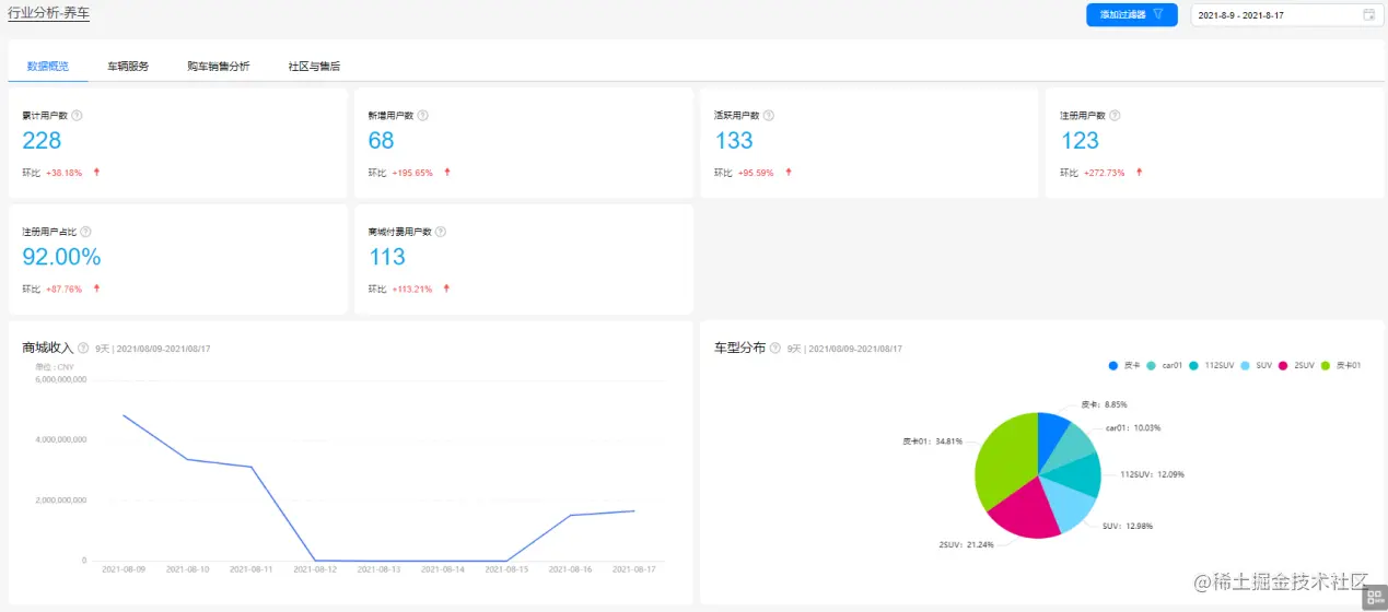 注册、新增、活跃、付费用户数都是最基本的运营指标,加入数据概览看板,便于运营人员清晰了解整体运营情况。同时数据概览看板可视化呈现的两个数据:车型分布和商城收入,帮助运营人员实时了解APP内车主绑定的车型分布现状及营收情况,及时针对重点车型调整产品服务和运营策略。