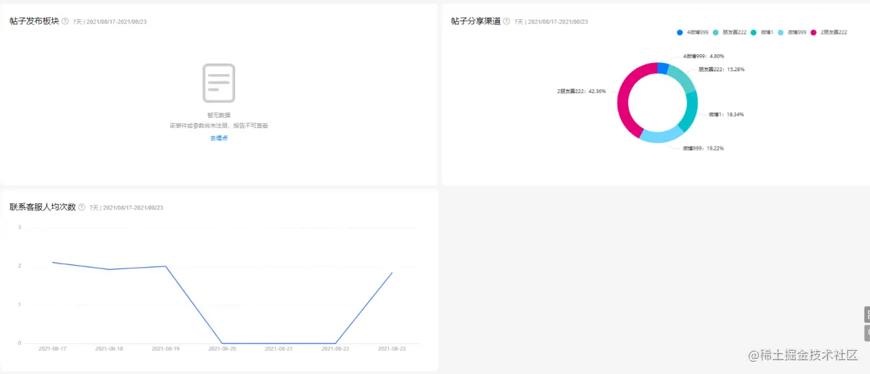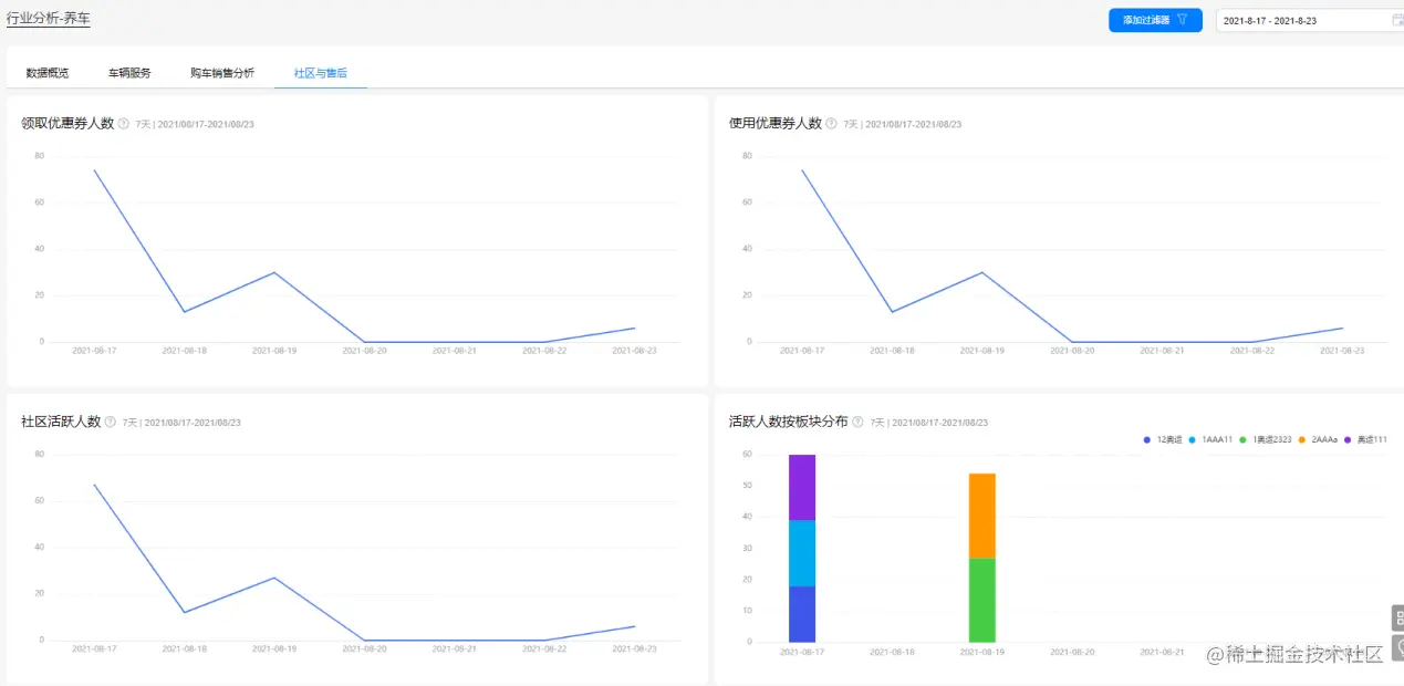 社区与售后看板聚焦用户参与和用户反馈,从领取优惠券人数、使用优惠券人数了解优惠活动参与度,挖掘价格敏感用户;从社区活跃人数、活跃人数按板块分布、帖子发布版块及分享渠道、联系客服人均次数等维度掌握社区人群动向,真正解决用户痛点,驱动用户价值升级。