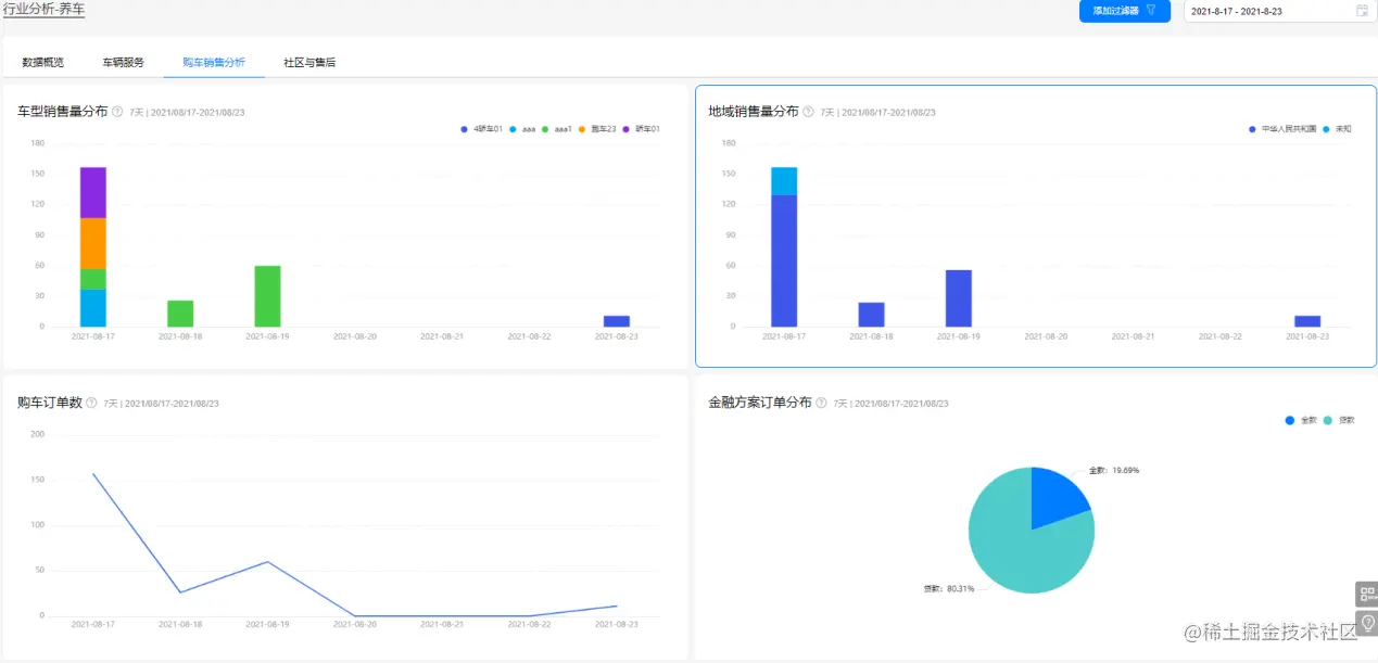 购车销售分析看板从车型销售量分布、地域销售量分布、购车订单数、金融方案订单分布、金融产品倾向分布等维度,呈现用户购车偏好,便于车企调整商城的商品结构,同时也可以针对不同地域、不同车型偏好的客户进行车辆推荐,实现精准营销。