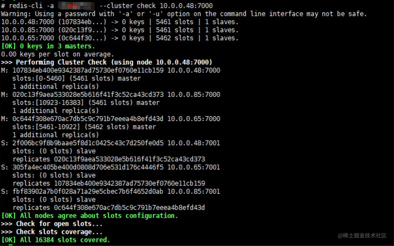 redis-cli -a 密码 --cluster check 10.0.0.2:7000