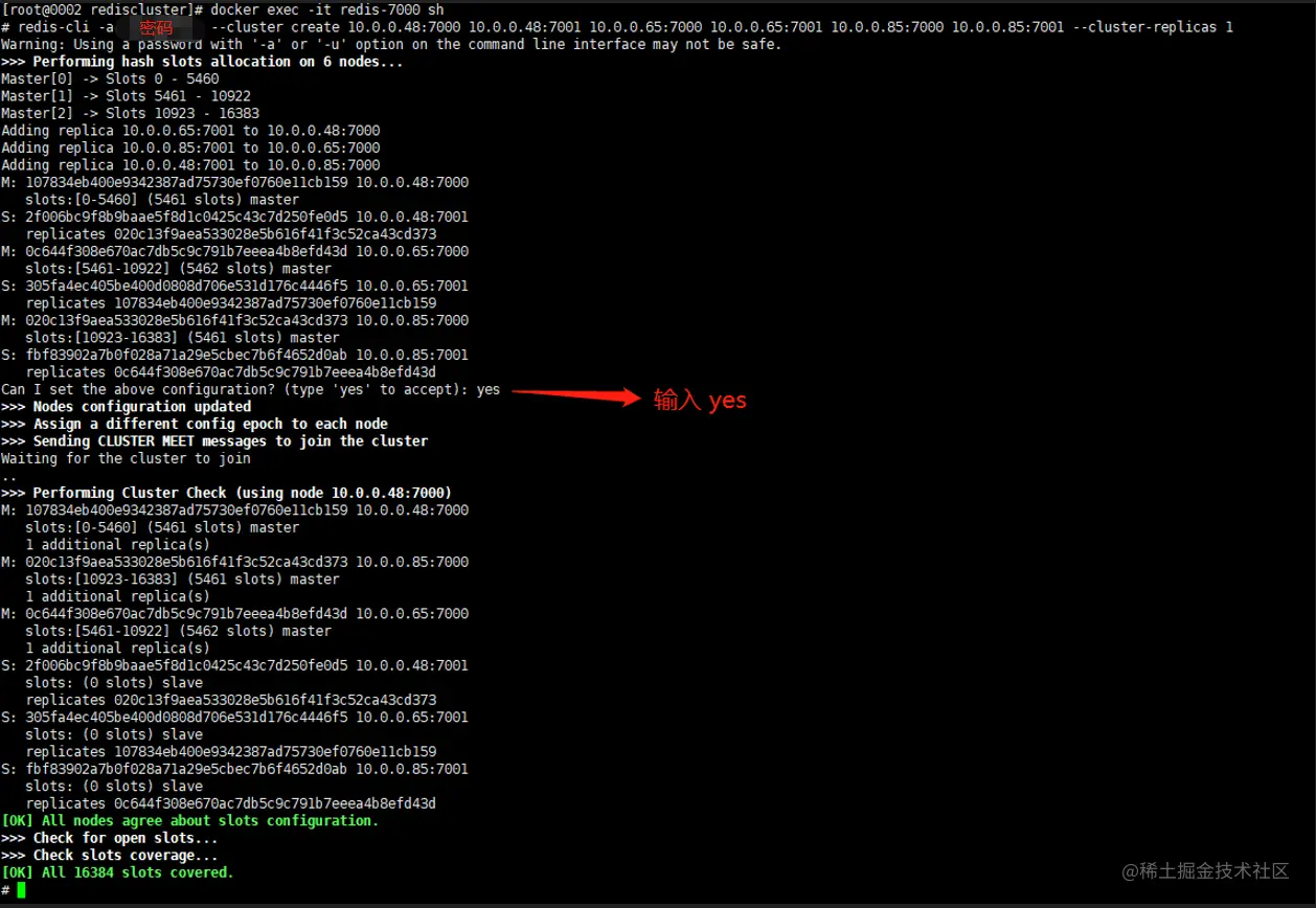 redis-cli -a 密码 --cluster create 10.0.0.2:7000 10.0.0.2:7001 10.0.0.3:7000 10.0.0.3:7001 10.0.0.4:7000 10.0.0.4:7001 --cluster-replicas 1