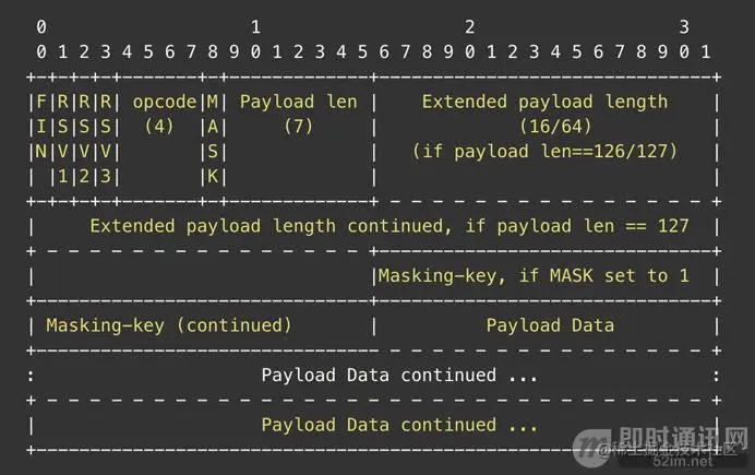 - 7)Extension data: x位,如果客户端与服务端之间没有特殊约定,那么扩展数据的长度始终为0,任何的扩展都必须指定扩展数据的长度,或者长度的计算方式,以及在握手时如何确定正确的握手方式。如果存在扩展数据,则扩展数据就会包括在负载数据的长度之内;