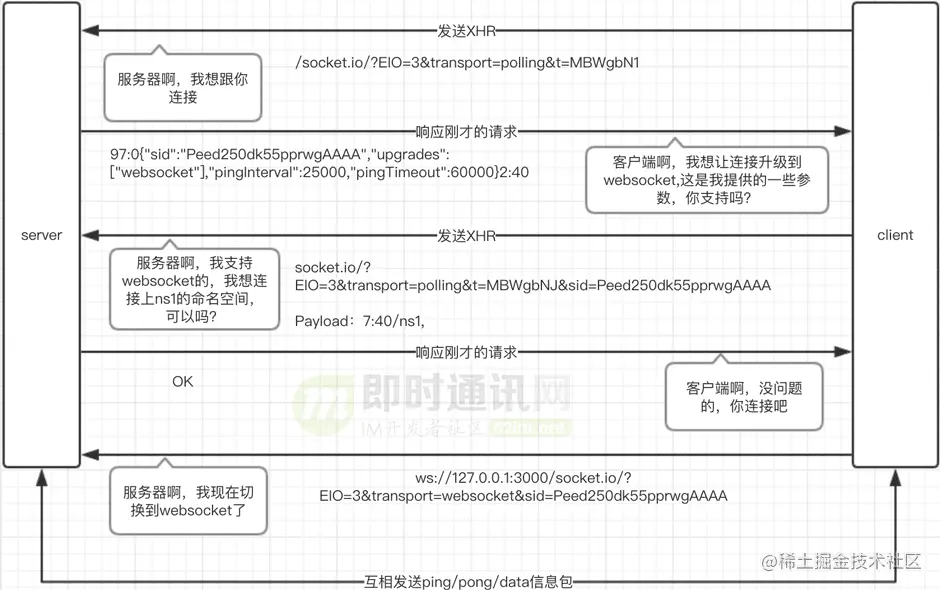 然后服务端会告知客户端去尝试升级到websocket,并且告知对应的sid。