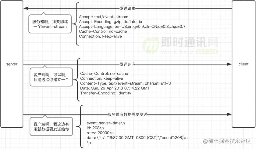 SSE的通信过程比较简单,底层的一些实现都被浏览器给封装好了,包括数据的处理。
