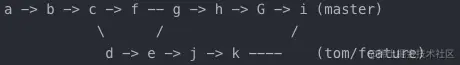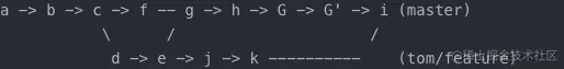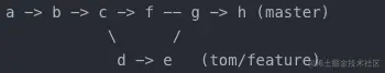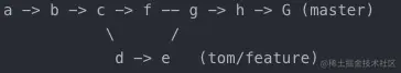 假设你在自己分支 tom/feature 上开发了一个功能,并合并到了 master 上,之后 master 上又提交了一个修改 h,这时提交历史如下