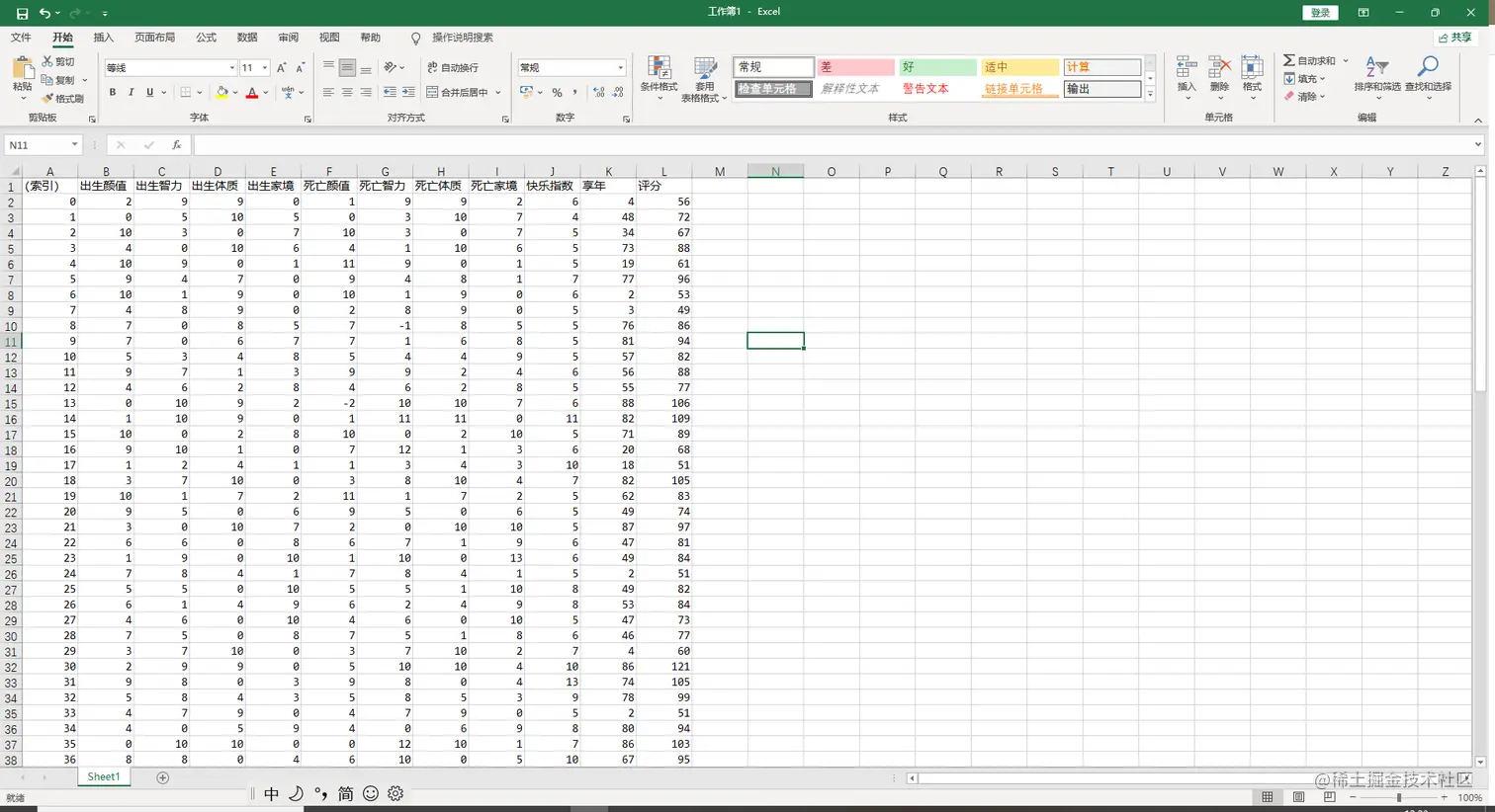 console.table(tableArr, ["出生颜值", "出生智力", "出生体质", "出生家境", "死亡颜值", "死亡智力", "死亡体质", "死亡家境","快乐指数","享年","评分"]);