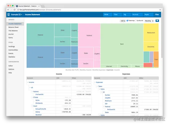 Faa是一个由社区维护的Beancount网络界面。它的核心是一个用于读取.beancount文件,并提供各种可视化功能,您会发现它们很有用。